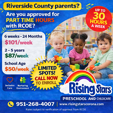 Rising Stars Preschool and Childcare is part of RCOE, CALWORKS, MCCYN, BRIDGE AND OTHER SUBSIDIES
